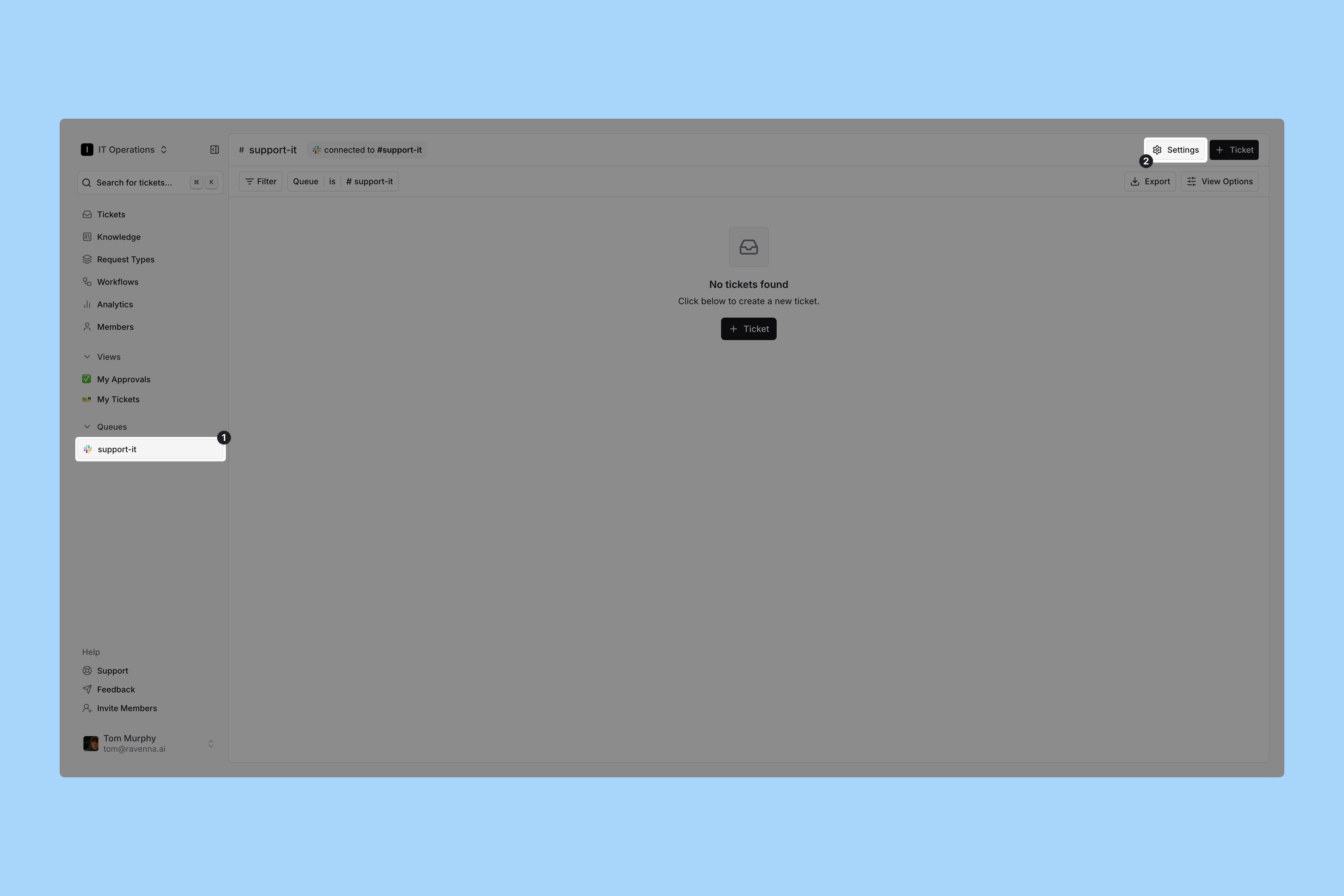 - Create ticket on 👎: If Ravenna responds using your Knowledge Base but the user feels it didn’t fully answer their question, clicking the 👎 button will create a ticket and pass it to your team for follow-up.