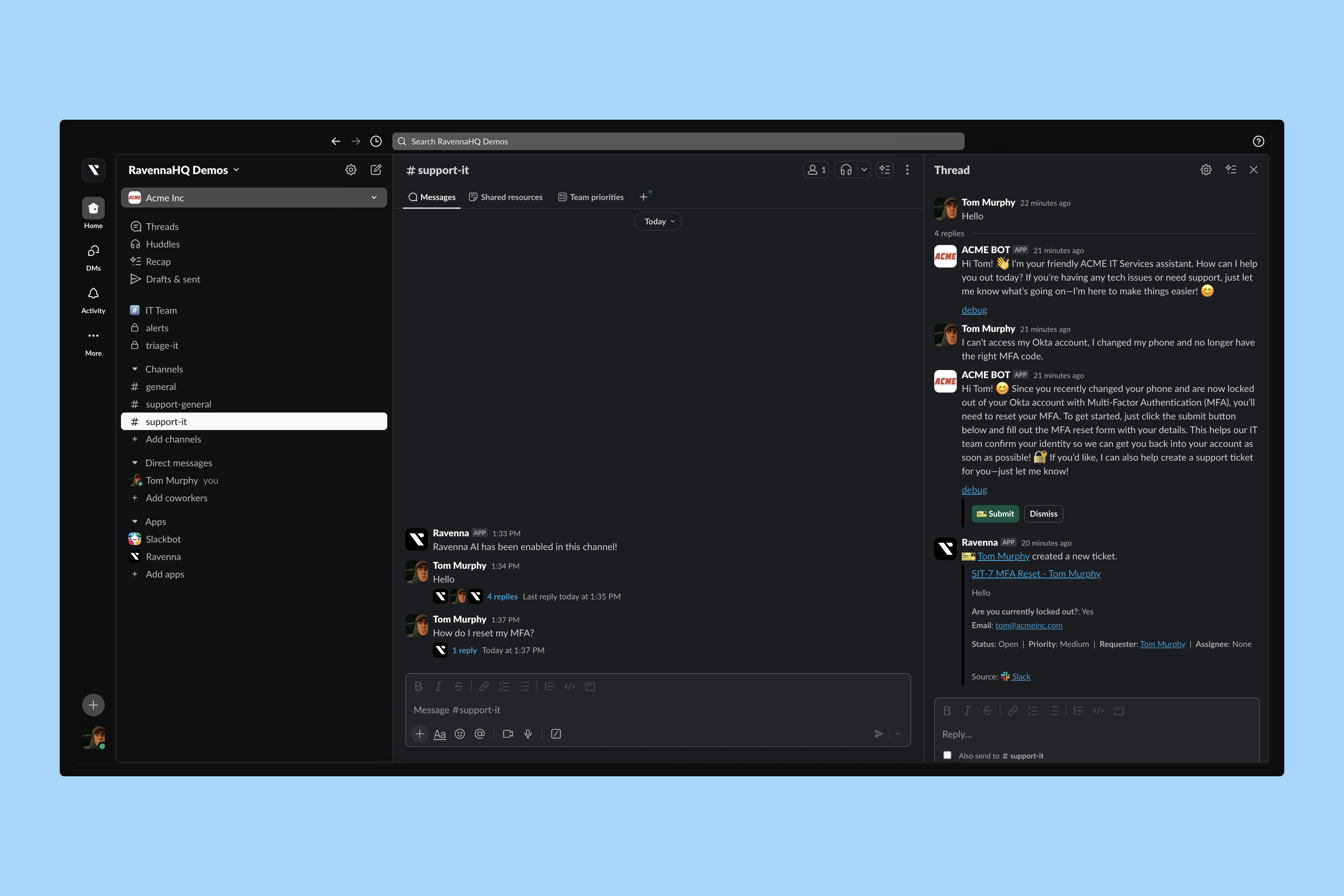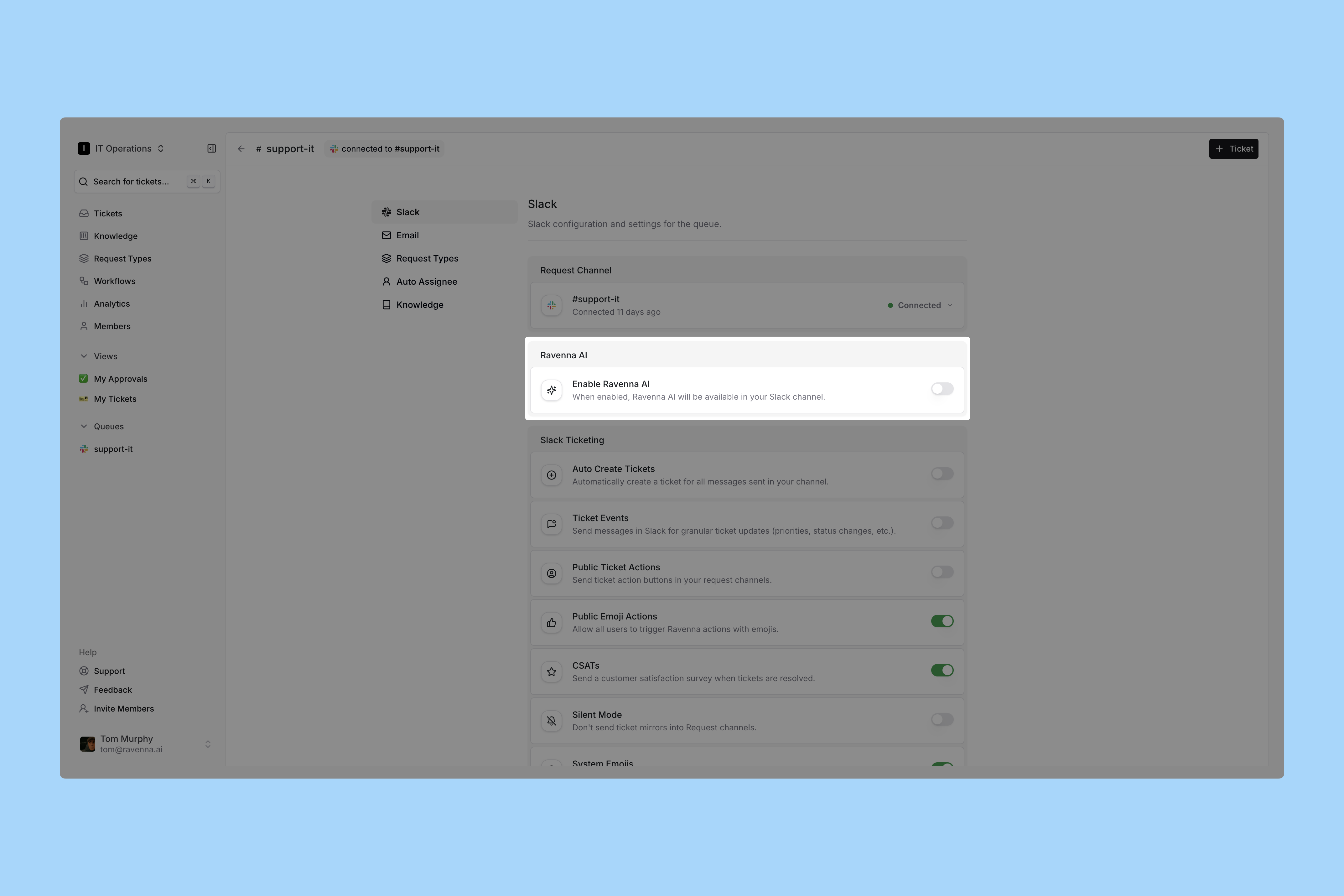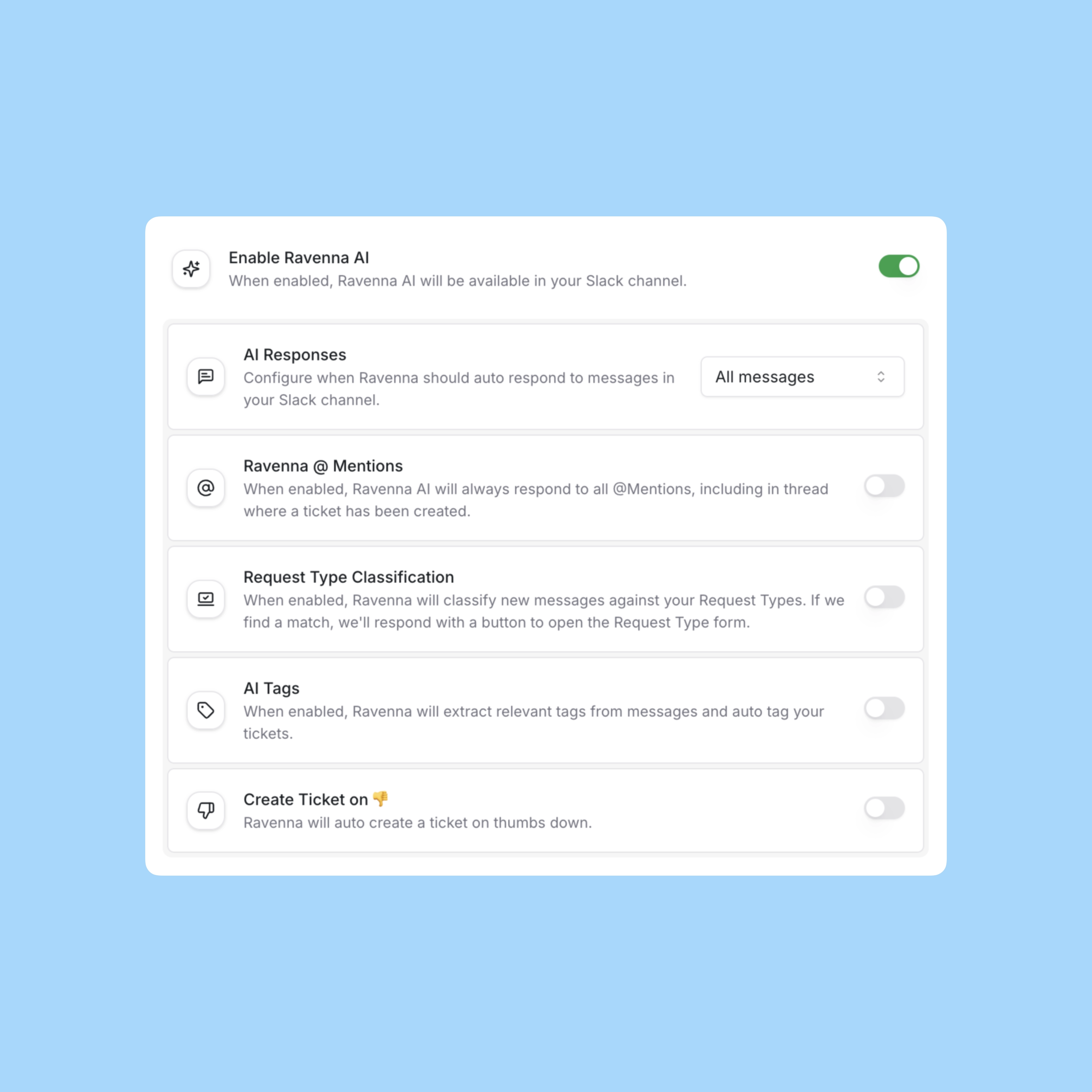 - Ravenna @ Mentions: If AI Responses is disabled, you can enable @ Mentions. Ravenna AI will respond whenever someone @ mentions the bot. This applies to both Slack channel messages and threads.